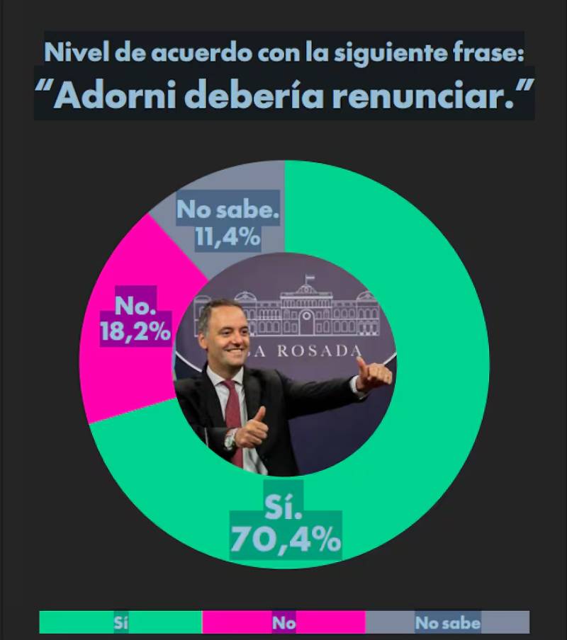 La defensa oficial tampoco convenció: el 70,2% interpreta que la respuesta del Gobierno fue una forma de «tapar o dejar pasar» el asunto, mientras que solo el 15,3% la considera transparente. El dato más contundente es el pedido de renuncia: el 70,4% cree que Adorni debería dejar su cargo, frente a un 18,2% que se opone.
