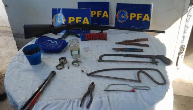 Los efectivos secuestraron diversas pinzas, alicates, sierras de corte, tijeras, una pinza de fuerza, cúteres, un machete, una escopeta con sus respectivas municiones, 180 gramos de cogollos de marihuana y un plantín de la misma droga, 150 semillas de cannabis sativa, una balanza de precisión, 60 mil pesos y un teléfono celular.